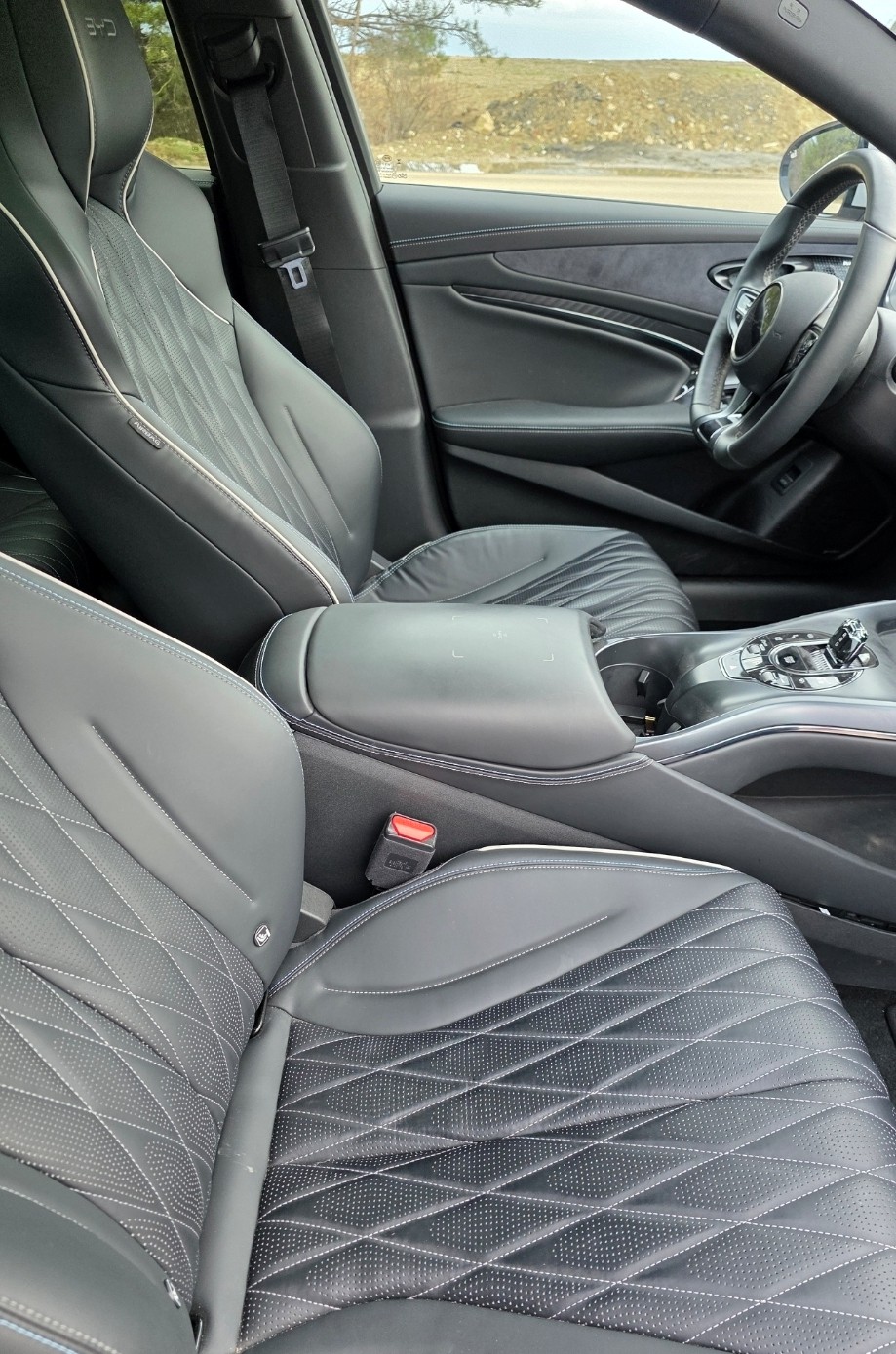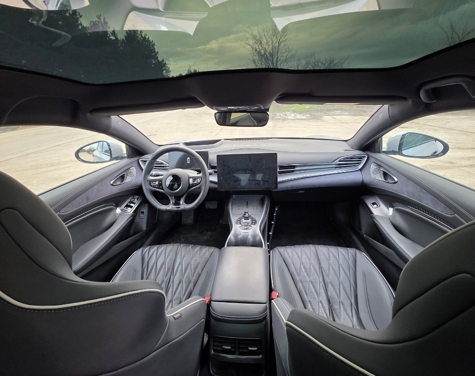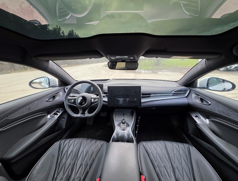 Luxury Interior: The cabin features a panoramic glass roof, premium vegan leather upholstery, and ventilated/heated front sports seats, blending sportiness with comfort.