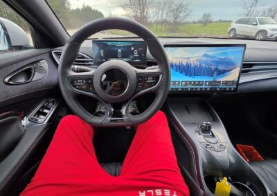 Suspension: Features a double-wishbone front suspension and a rear-mounted electric motor, contributing to a balanced ride that is both comfortable and dynamic.