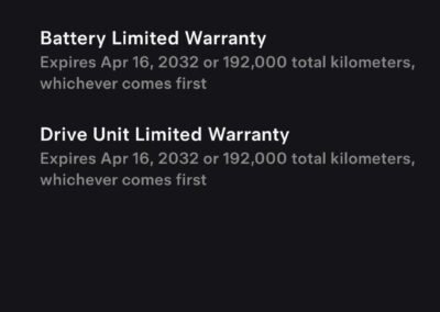 • Battery & Drive Unit Warranty: 8 years or 120,000 miles for the Long Range model, guaranteeing minimum 70% battery capacity retention.